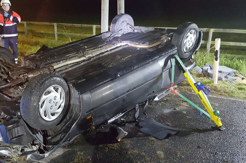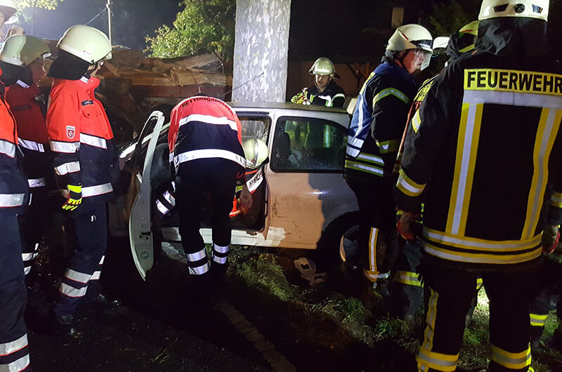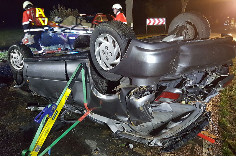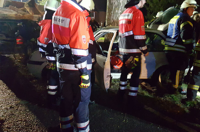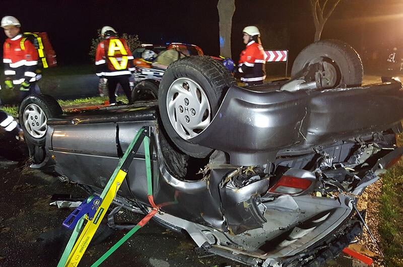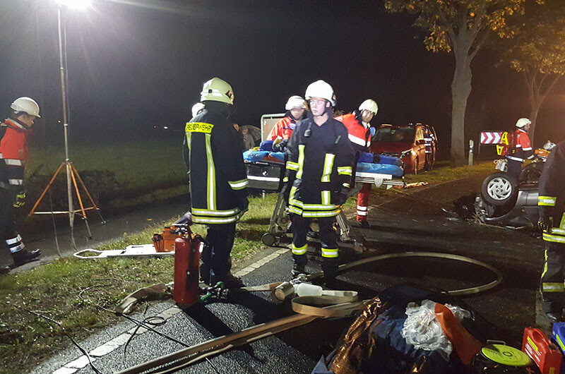 Laiendarsteller mit Kunstblut „verschmiert“, liefen hilferufend umher oder lagen nach Schmerzen klagend im „verunfallten“ Fahrzeug, sorgten zusätzlich für eine realitätsnahe Atmosphäre. Schwere Übungspuppen wurden dann aber doch besser Kopf überliegend, in dem auf dem Dach sich befindliche Unfallfahrzeug, verwendet. Es herrschten schnelle Bewegungsabläufe, wie eine Schar von Ameisen, unter den Einsatzkräften. Jeder wusste was zu tun war oder wurde daran erinnert (deswegen ja die Übung).