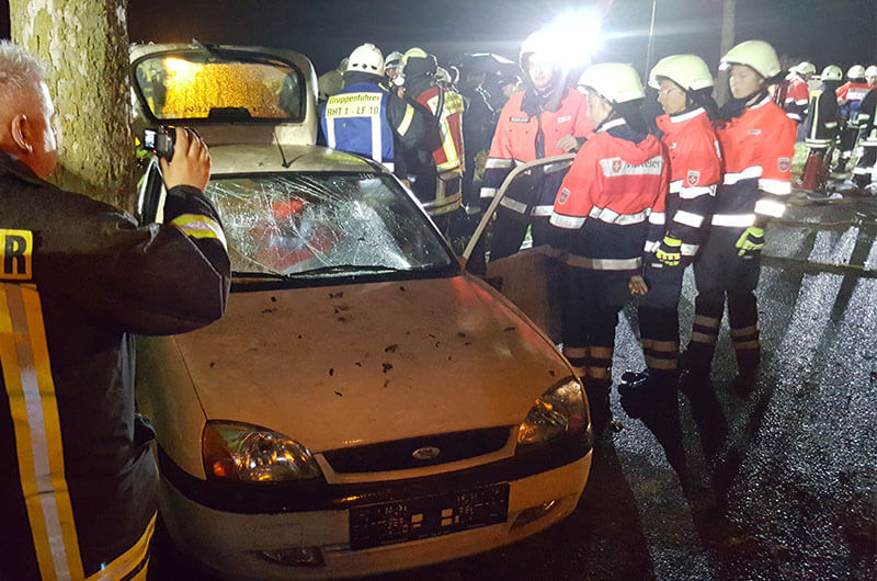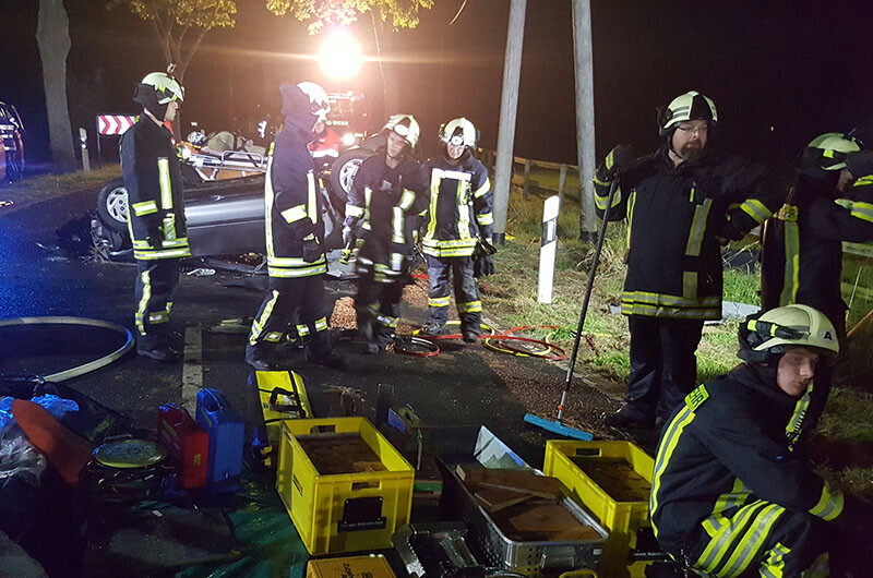 Die Feuerwehren waren damit beschäftigt, die Vielzahl an Verletzten aus den verbeulten und gequetschten Fahrzeugen zu retten. Spreizer, Schere, Unterbaumaterial, sehr viel künstliches Licht uvm. hatten Hochkonjunktur. Ein Wirrwarr von Kabeln, hydraulischen Schläuchen und Wasserschläuchen säumten die Straße, untermalt von Kommunikation jeglicher Art. Der Malteser Hilfsdienst nahm die Verletzten entgegen und unterstützte bei der Rettung. Der Psychologische Dienst (PSU) wurde ebenfalls angefordert, denn bei solchen Einsätzen sind sie die Hilfe für die Einsatzangehörigen und auch für die Betroffenen eines Geschehens dieser Art.