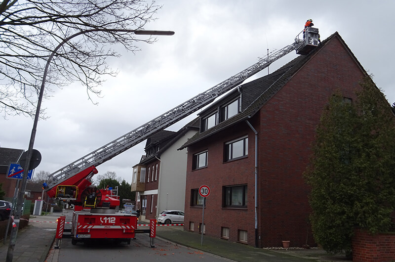 Die Drehleiter (DLK) riss im Ortsgebiet ihre Aufträge ab wie an einem Abreißblock und war zum Pausieren am Gerätehaus Vluyn so gut wie gar nicht zu sehen. Bei starken Böen war es für den Trupp eine wackelige Angelegenheit.