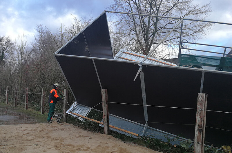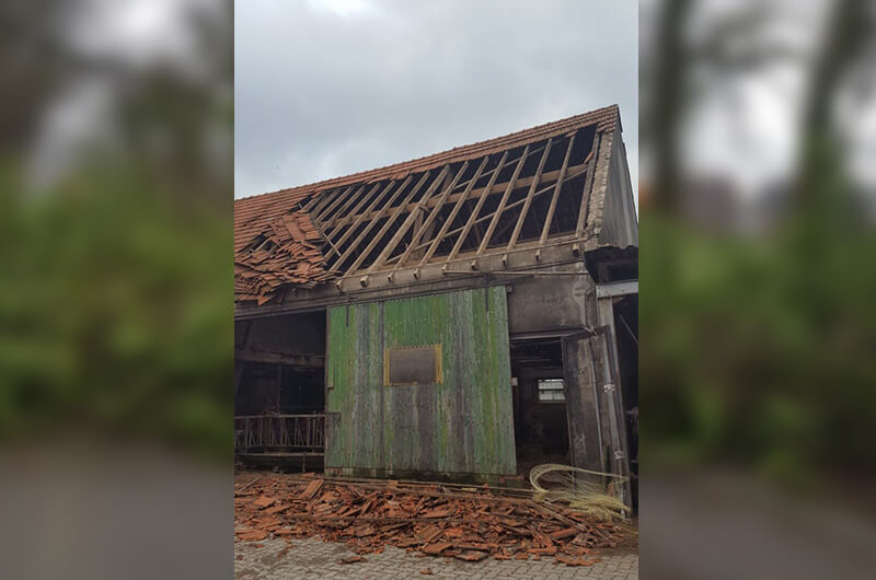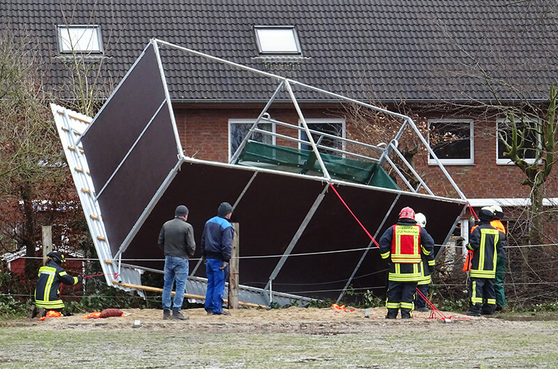 freddy_scheuendach_ziegellosAb ca. 10:35 Uhr nahm der Wind und die Böen schlagartig zu. Ab diesem Zeitpunkt gingen dann zahlreiche Anrufe bei der Kreisleitstelle in Wesel ein und die Anzahl der Einsätze auf dem Kreisgebiet häuften sich ins Unermessliche.