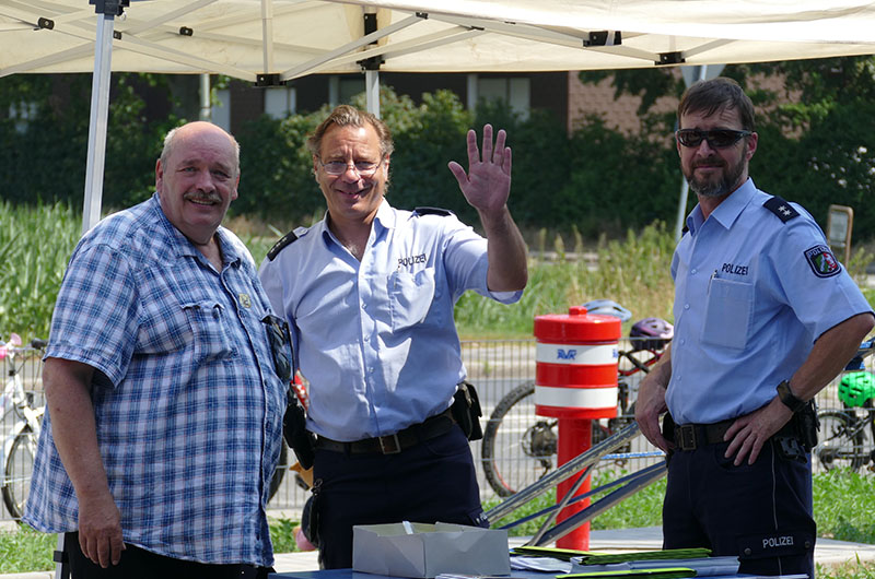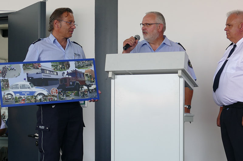 Die Partnerfeuerwehr Ledgen überreichte feierlich Geschenke und stärkte durch ihre Anwesenheit die lang anhaltende Freundschaft mit dem LZ Neukirchen. Und das war noch nicht alles. Die Polizei, die stets mit der Feuerwehr zusammen am Einsatzort auftritt, überreicht eine von sich aus handgefertigte Foto-Collage. Auch sie waren mit einem Infostand und einem Polizei-Oldtimer VW Käfer vor Ort.