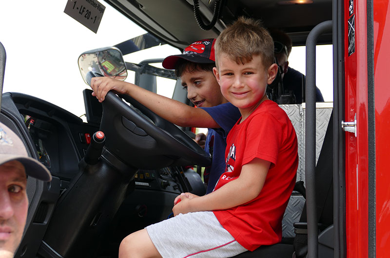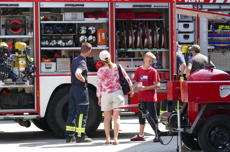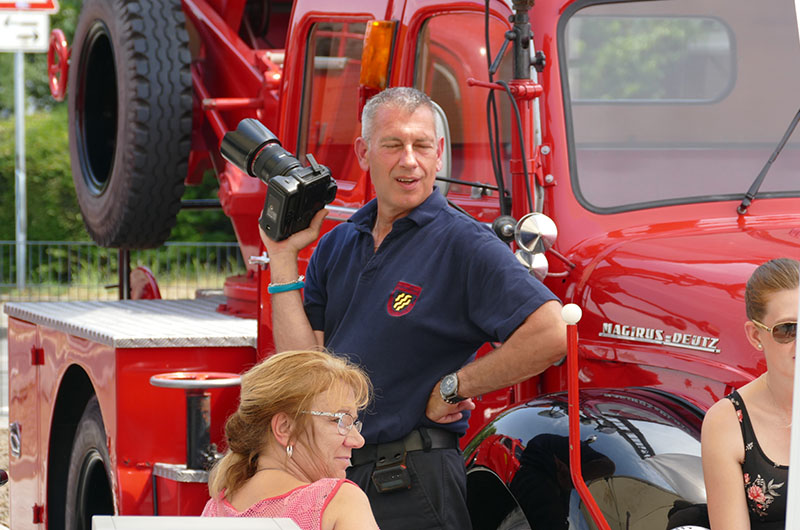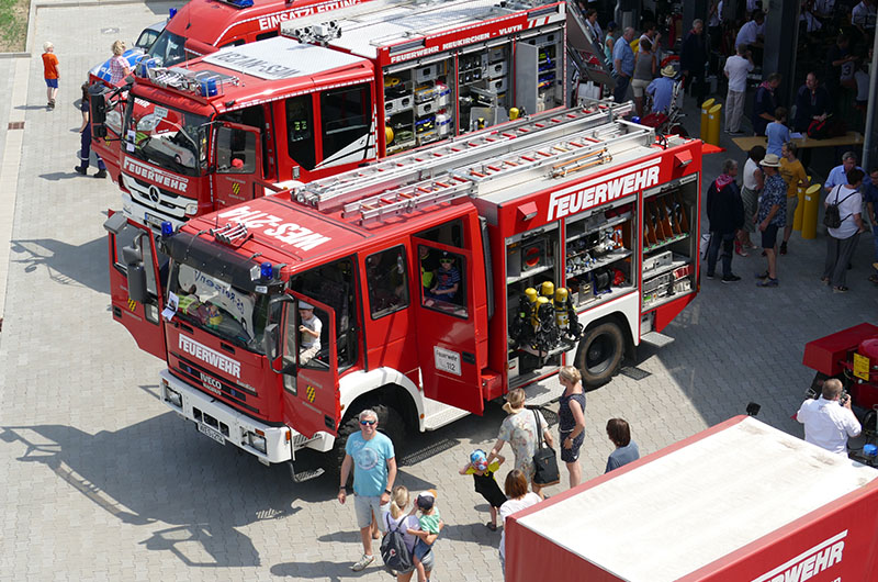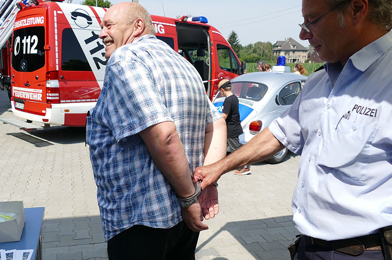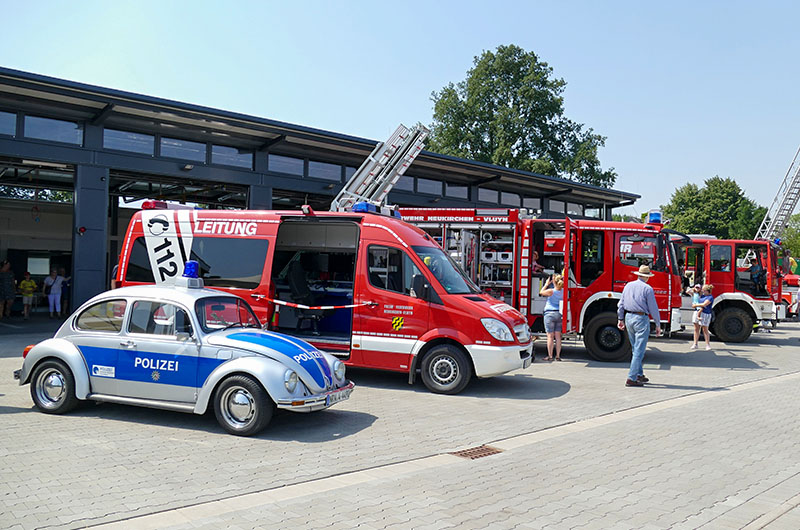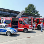 Reichlich Einsatzfahrzeuge waren zu vermelden und konnten dank des großen Außengeländes, bestens für die Fahrzeugshow präsentiert werden. Historische oder aktuelle Einsatzfahrzeuge, Rettungswagen und ein Polizei-Einsatz-Käfer sorgten für ein farbenfrohes Bild. Wer sich mit den historischen Fahrzeugen ablichten und die Fotos direkt mitnehmen wollte, hatte Glück. Hier wurde ein kleines Fotoshooting mit anschließender Bildermitnahme als Andenken angeboten.