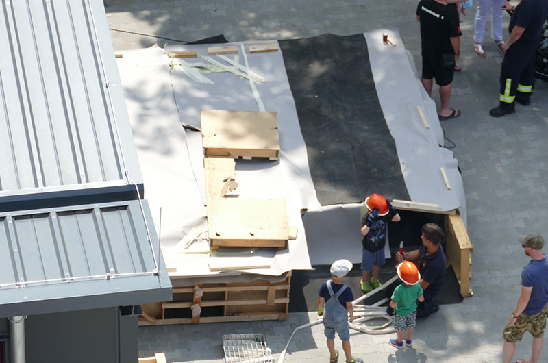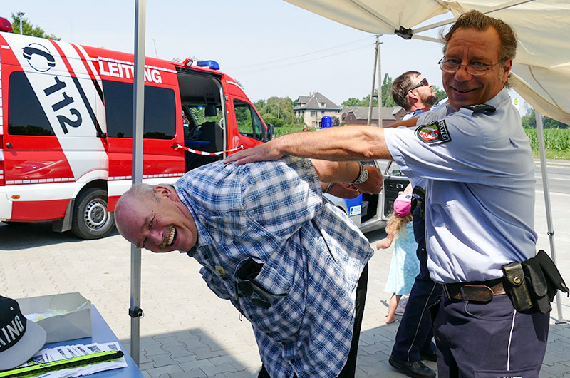 Aber auch die Großen konnten mitmischen. Hier wurde die Station Feuerwehr zum Anfassen angeboten, wo jeder die Möglichkeit hatte, sich in kompletter Feuerwehrausrüstung inklusive unter schwerem Atemschutz angelegt, eine Runde unter Beobachtung auf dem Hinterhof absolvieren. Ja, da kamen so einige Leute ins Schwitzen.