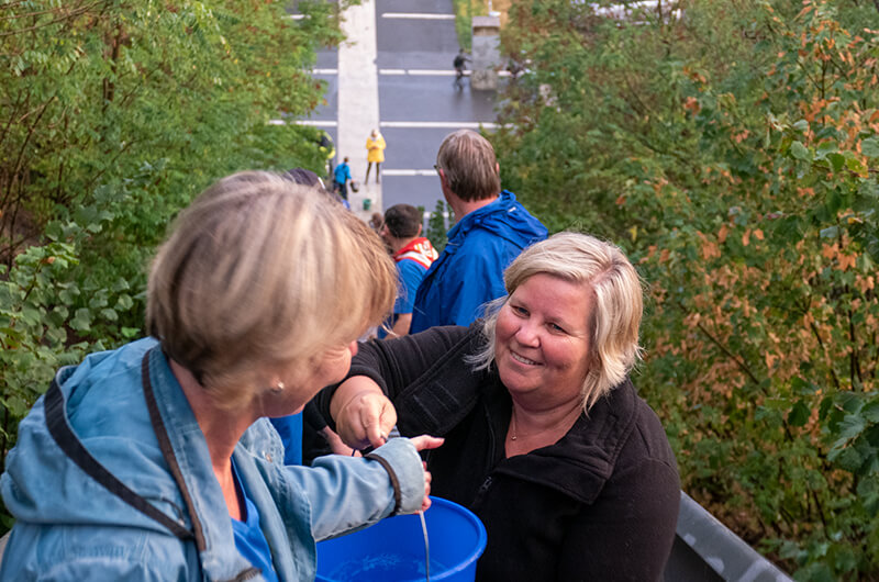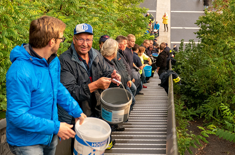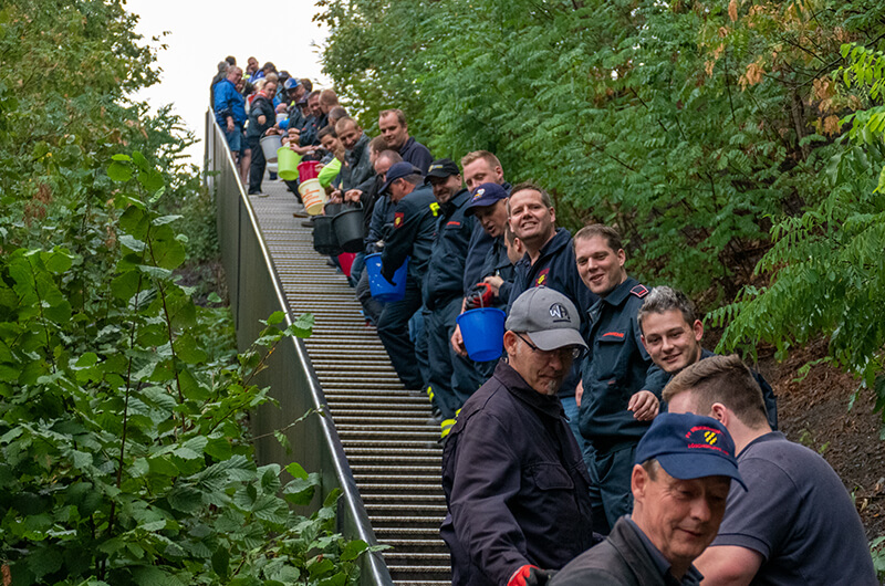 Die Himmelstreppe an der Halde Norddeutschland biederte sich förmlich dafür an und so wurde die von Monika und Guido Lohmann initiierte Spendaktion „Bewegen hilft“ wieder mal ein voller Erfolg. In einer gemeinschaftlichen Aktion mit den Klompenfreunden, dem Sportverein SVN, den Schützen, Bürgermeister Harald Lenßen und der Freiwilligen Feuerwehr Neukichen-Vluyn, wurden eimerweise Wasser die Himmelstreppe von Hand zu Hand weitergereicht.