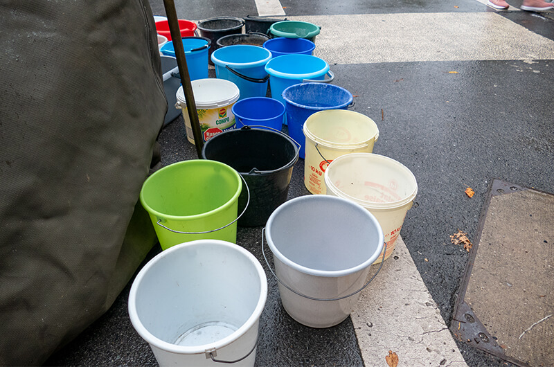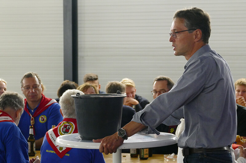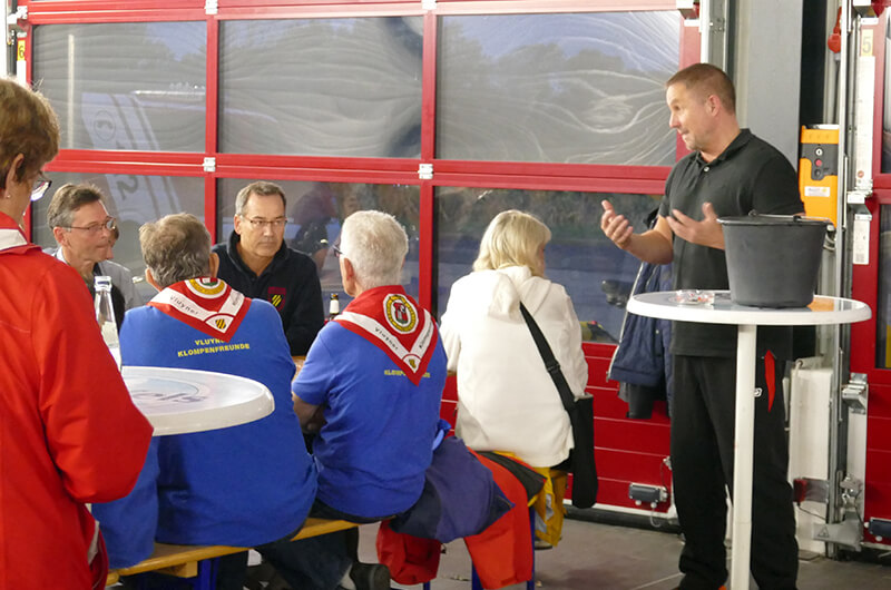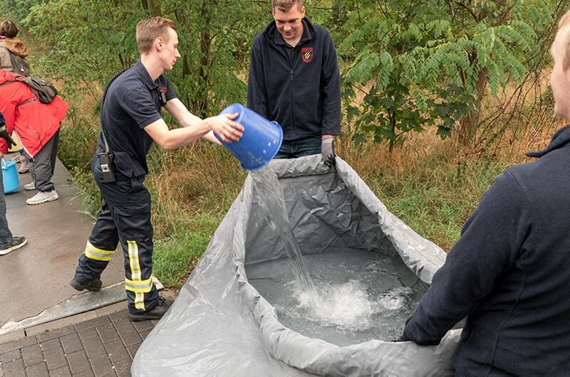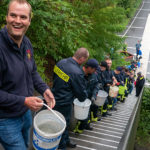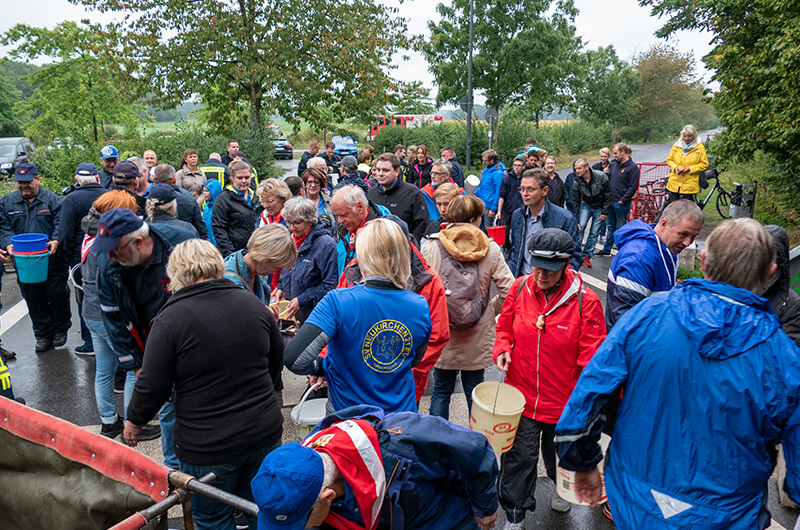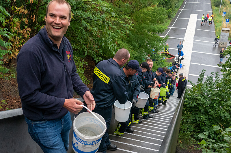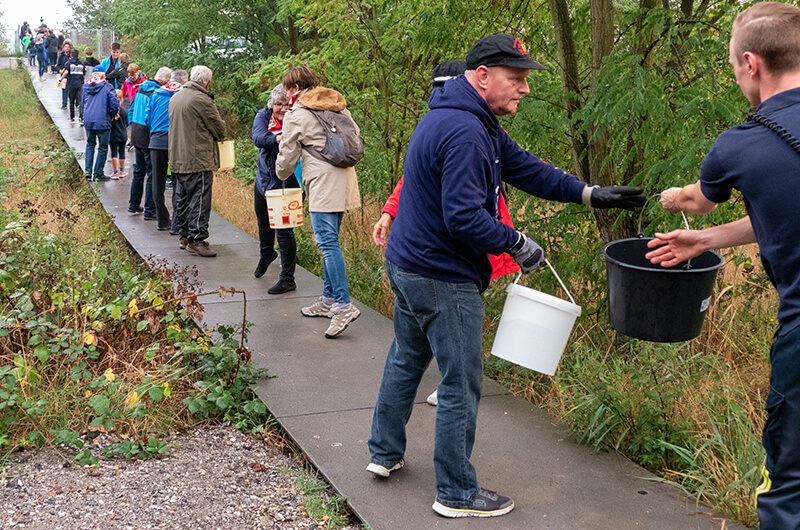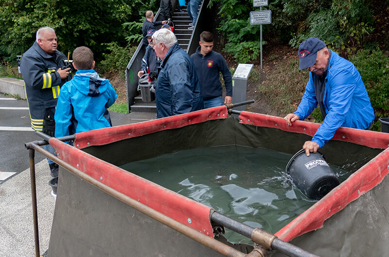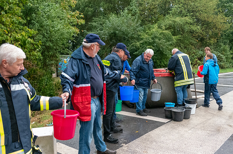 Wie vor über 100 Jahren wurde die menschliche Wasserversorgung bei einer Brandbekämpfung mittels Ledereimer zur Unterstützung für die damalige Feuerwehr durch die Dorfbewohner hilfreich angewendet. In unserem Fall reichten reguläre Plastikeimer.