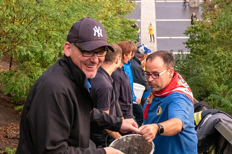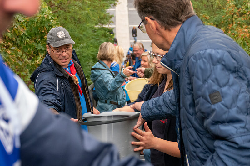 Da wurde geächzt, da wurde geschnauft aber auch viel gelacht. Einige Winkearme wurden straffer und der Muskelkater bahnte sich schon an. Vermutlich haben unsere Vorfahren dieser Stadt vor hundert Jahren sich routinierter bewährt als wir uns in deren ersten Minuten auf der Treppe, wobei wir fairerweise sagen müssen, das die Halde damals noch nicht vorhanden war und bei uns war keine Eile geboten, denn es handelte sich ja immerhin um eine Spendenaktion. Routine kam dann bei der Eimerkette später auf, wo man die optimale Position und den richtigen Takt ruckzuck gefunden hatte. Über 350 Stufen, einige Meter Weg und über 600 Liter bei ca. 100 anwesenden Frauen, Kinder und Männern wurden, bis zum mobilen Wasserauffangbecken, gemeistert.