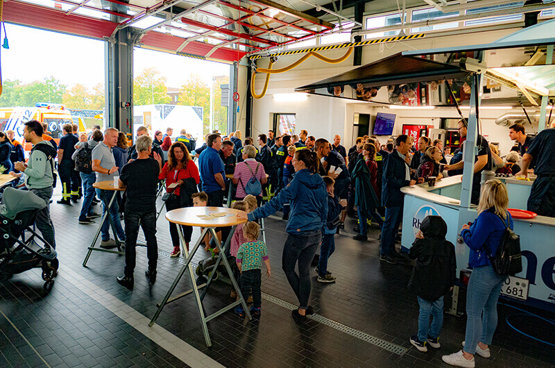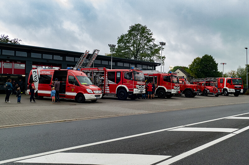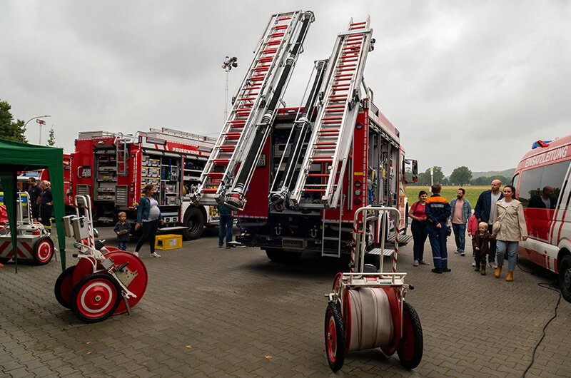 Die große Halle des Gerätehauses sorgte aber für reichlich Schutz vor schlechtem Wetter. Die Hüpfburg sorgte für trocken bleibende Füße sowie für die Sitzmöglichkeiten an dem Jugendfeuerwehrcafé. Der Fahrzeugpark konnte unterdes wie üblich vor den Toren des Gerätehauses bestaunt werden. Von historischen bis aktuellen Einsatzfahrzeugen der Feuerwehr sowie der Polizei und dem Rettungswagen standen für eine Begutachtung.