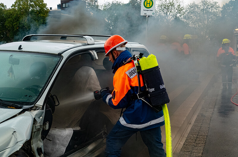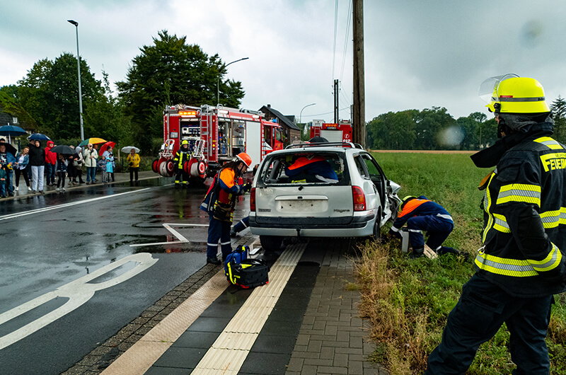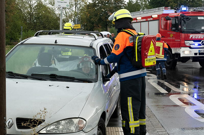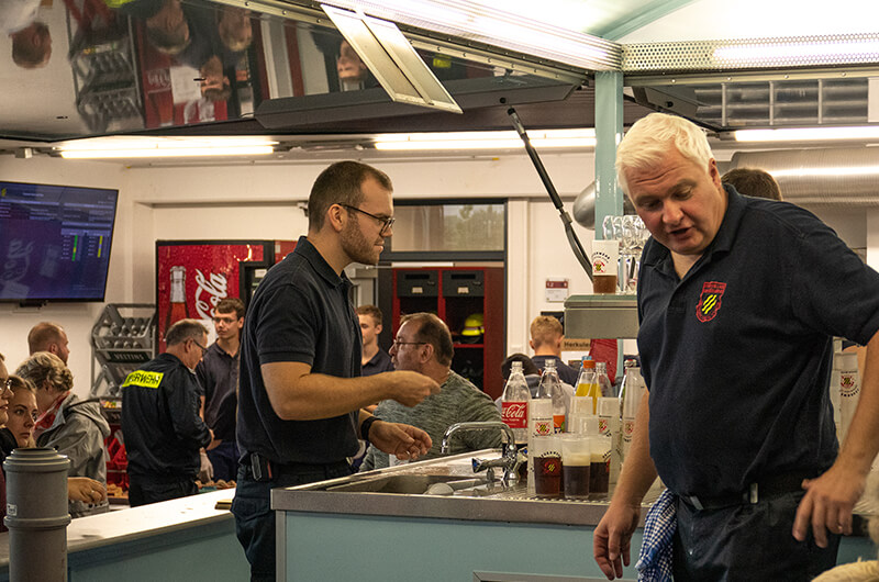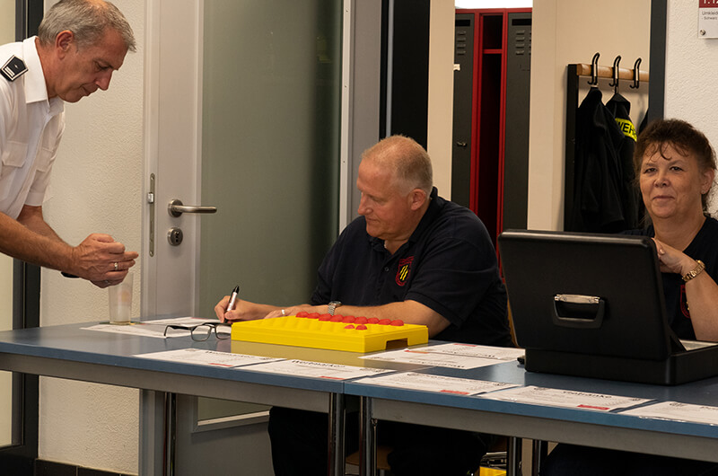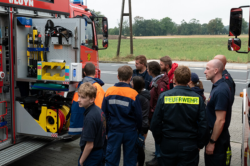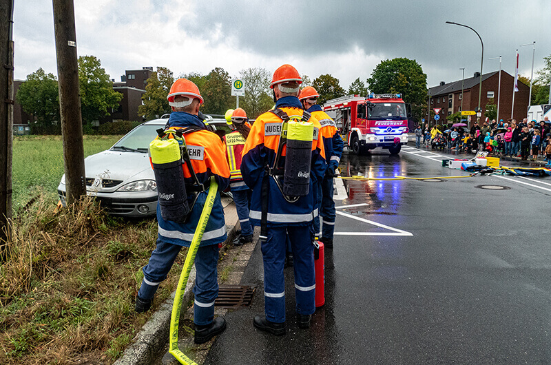 Die Einsatzkräfte des Löschzugs wiederum zeigten mal dem Publikum, wie der Ablauf bei einem Melderruf ist, um zu verdeutlichen, wie viel Zeit verstreicht, bis das erste Einsatzfahrzeug bei einer freiwilligen Feuerwehr ausrückt. Anschließend wurde ein Einsatzszenario am Fire Trainer mit eingebunden.