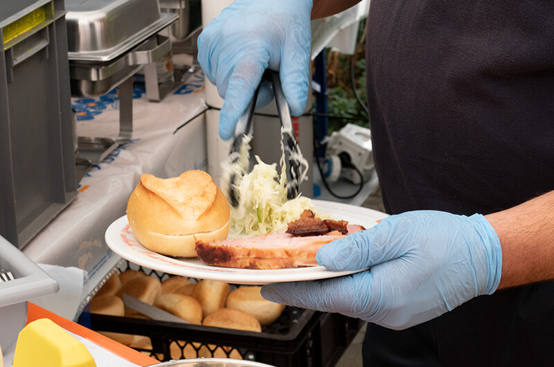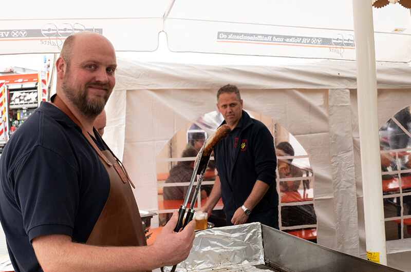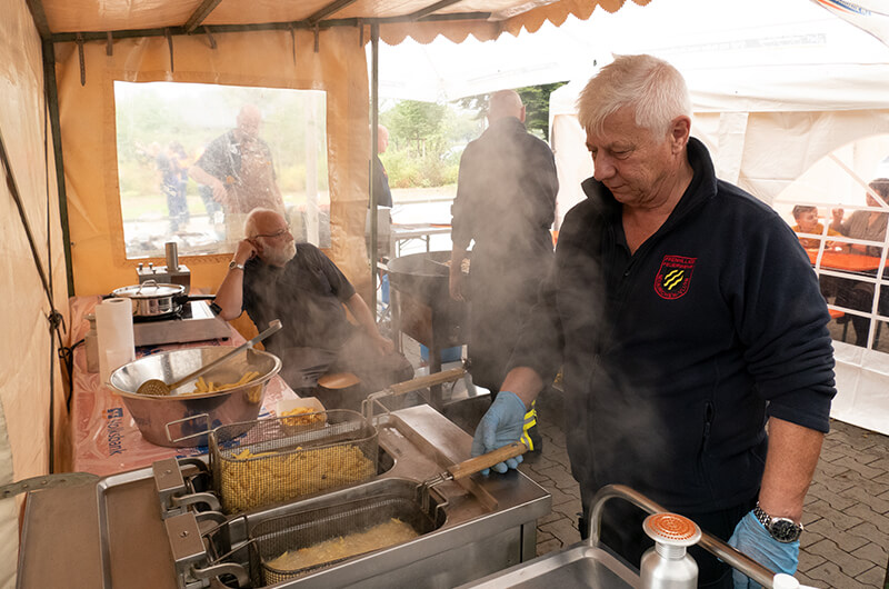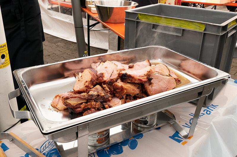 Der Grillstand war ebenfalls vorbereitet. Pilze in leckere Knoblauchsoße, Grillfleisch und Würstchen, unsere bekannten knackigen Pommes sorgten für starken Andrang. Aber das neue Highlight war dieses Mal: der Krustenbraten. 3 Stunden im Bräter, danach schön im Sauerkraut gebettet. Der neue Renner auf dem Brandschutztag des Löschzug Neukirchen.