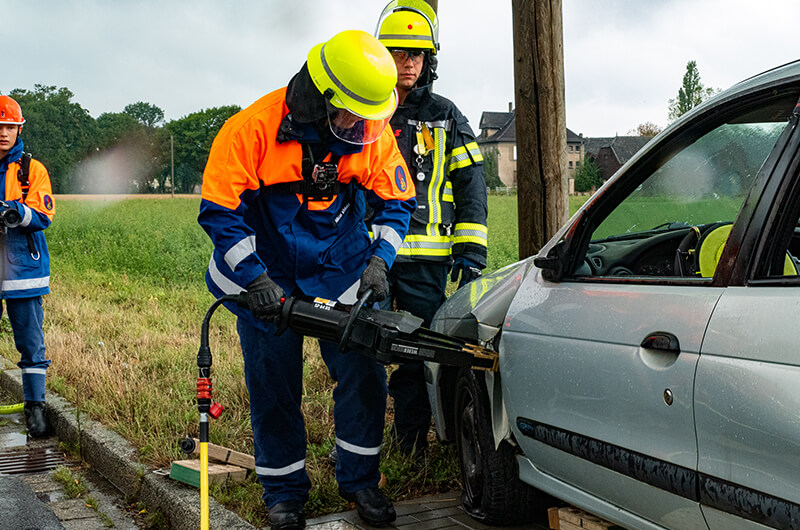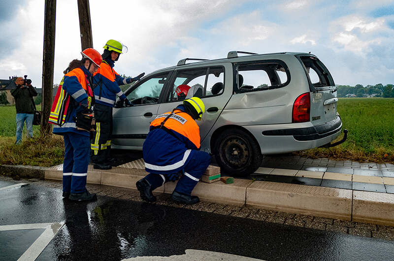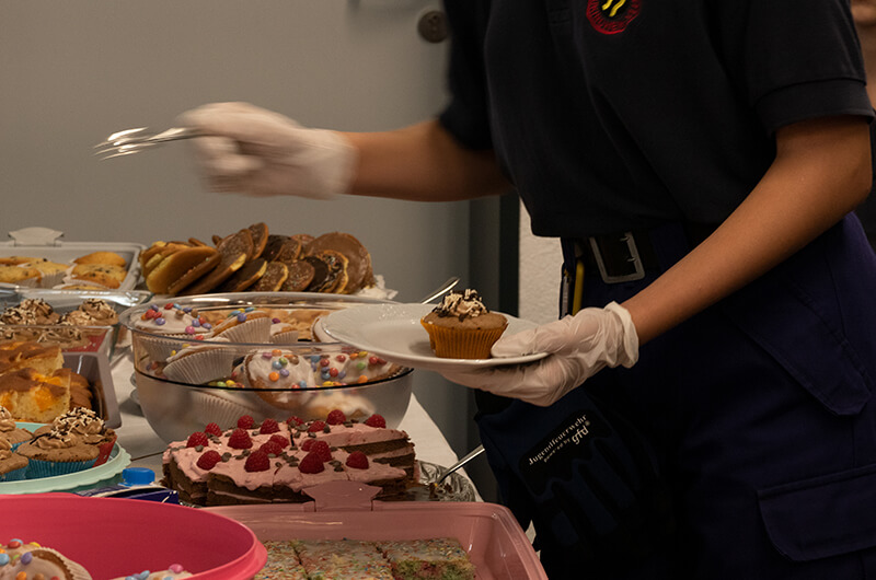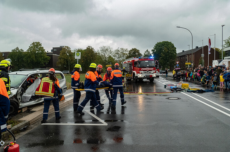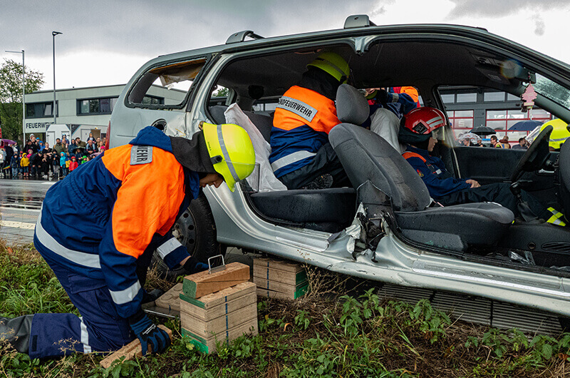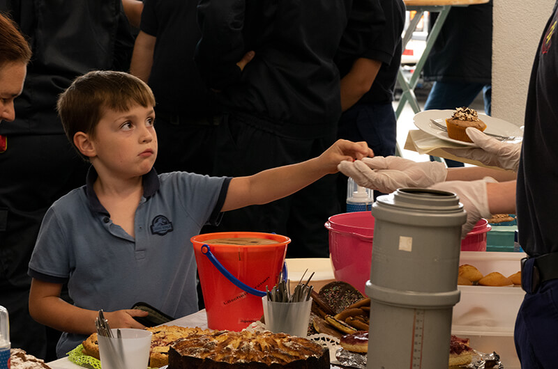 Das Jugendfeuerwehrcafé kredenzte wieder eine bunte und große Auswahl an Kuchen. In ihrer Einsatzshow zeigte die Jugendfeuerwehr dann ihr Können bei einer technischen Hilfeleistung. Eine eingeklemmte Person im verunfallten Fahrzeug musste gerettet werden. Mit einer zügigen Einsatzanfahrt in den Einsatzfahrzeugen wurde die Show noch ein wenig realistischer gestaltet.