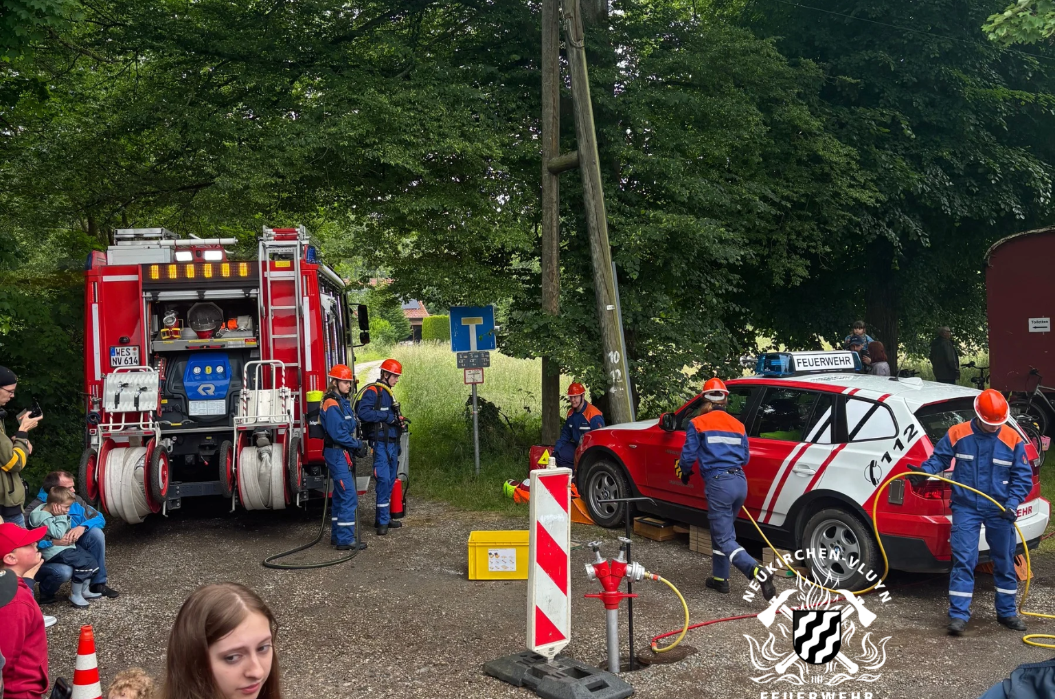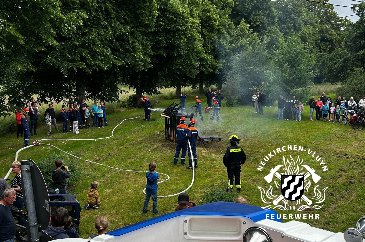 Die Jugendfeuerwehr zeigte ihr Können bei zwei verschiedenen Übungen. Die erste Übung simulierte einen Verkehrsunfall, bei dem eine Person unter einem Pkw eingeklemmt war. Diese Person musste als Erstes gerettet werden – mithilfe eines Hebesatzes, der auf dem Rüstwagen verstaut ist. Eine zweite Person war im Pkw eingeschlossen und konnte das Fahrzeug nicht eigenständig verlassen – auch sie wurde erfolgreich befreit. Am Nachmittag folgte eine weitere Übung: Ein kleines Holzhaus auf einer Wiese stand in Flammen und wurde von der Jugendfeuerwehr gelöscht. Ein Infostand über die Kinder- und Jugendfeuerwehr war ebenfalls aufgebaut.