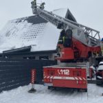 Vor Ort wurde die Drehleiter in Stellung gebracht und die Schneeschicht wurde mittels Schippen abgetragen. Teilweise war auf dem Dach eine Schneeschicht von 60cm gegeben.
