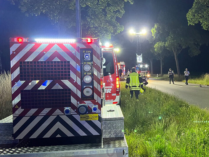 Aufgrund der zunehmenden Dunkelheit wurde um 23:00 Uhr die Löschgruppe Niep alarmiert, um der Polizei die Einsatzstelle zur Unfallaufnahme auszuleuchten. Da sich die Unfallstelle über ca. 300 Meter erstreckte, entschied sich der Einsatzleiter dazu, den Löschzug Neukirchen nachzualarmieren. Da auch Bilder von der Unfallstelle gemacht werden mussten, wurde auch die Drehleiter vom Löschzug Vluyn zur Einsatzstelle alarmiert.