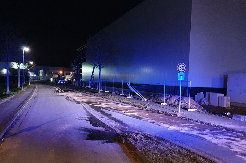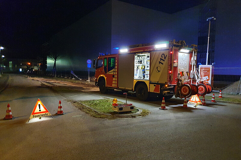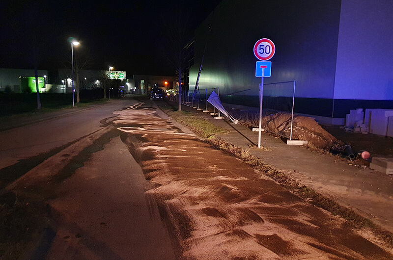 Ein Lastzug riss sich in den frühen Morgenstunden bei einem Abbiegemanöver den Treibstofftank auf. Bei einer kurzen Weiterfahrt flossen auf einer Strecke von ca. 200 m und 5 m Breite Diesel aus. Der Kraftstoff drohte auch in die Kanalisation zu laufen.