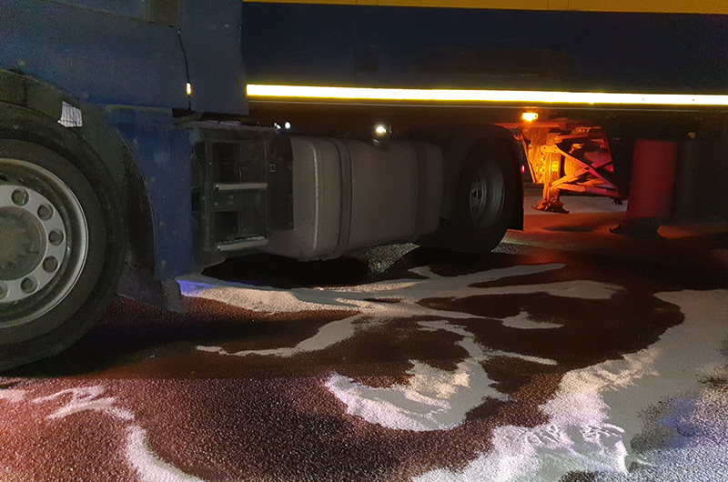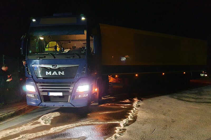 • Deutlich im Scheinwerferlicht ist die Breite des Ausmaßes des ausgelaufenen Diesel zu sehen