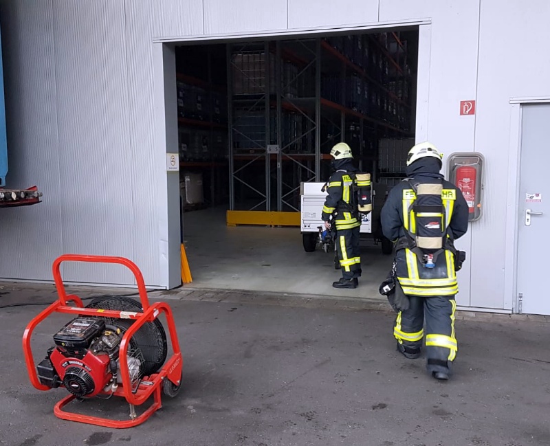 Vor Ort stellten die ersteinteffenden Einsatzkräfte eine Verrauchung einer Lagerhalle fest. Ein Trupp unter Atemschutz erkundete die Lagerhalle und stellte einen Brand in einer Öl–Heizungsanlage fest.