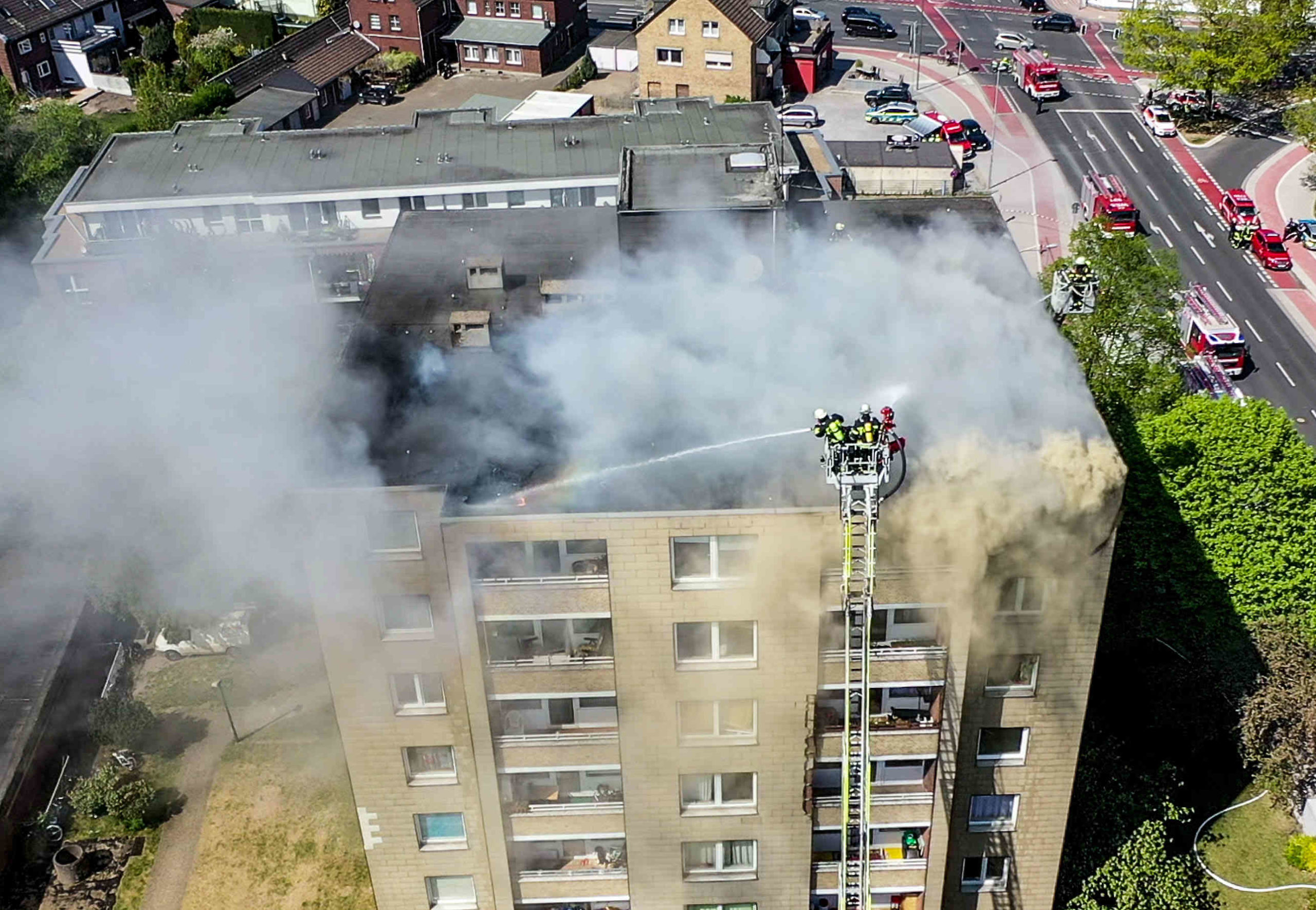Die Feuerwehr Moers bekämpfte seit dem Mittag einen Dachbrand auf einem 8-stöckigen Gebäude auf der Römerstrasse. Um besser an das Feuer gelangen zu können, wurden um 15:00 Uhr die Fog-Nails der Feuerwehr Neukirchen-Vluyn angefordert.