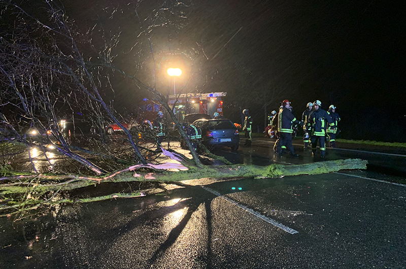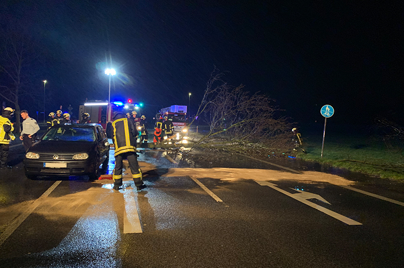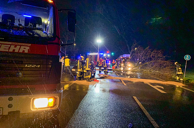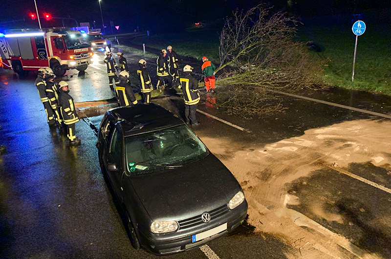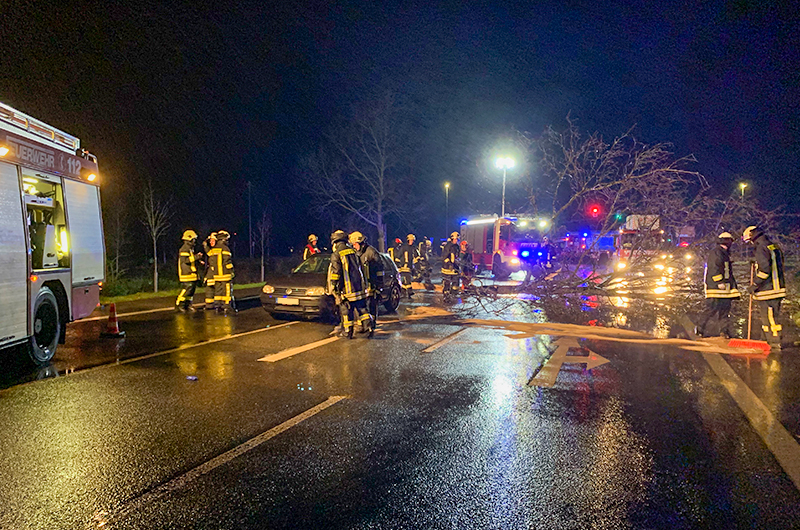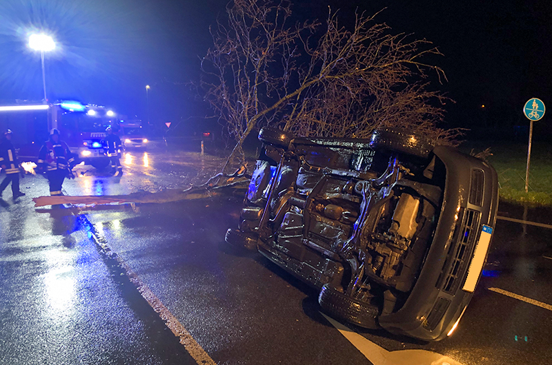 Am Sonntagabend wurden die Löschzüge Vluyn und Neukirchen mit dem Einsatzstichwort eingeklemmte Person zur Lintforterstraße alarmiert. Nach einem Schauer mit starken Windböen kam es zu einem Verkehrsunfall, bei dem ein Baum durch den Wind gegen ein fahrendes Auto prallte und dieses auf der Seite zum liegen kam.