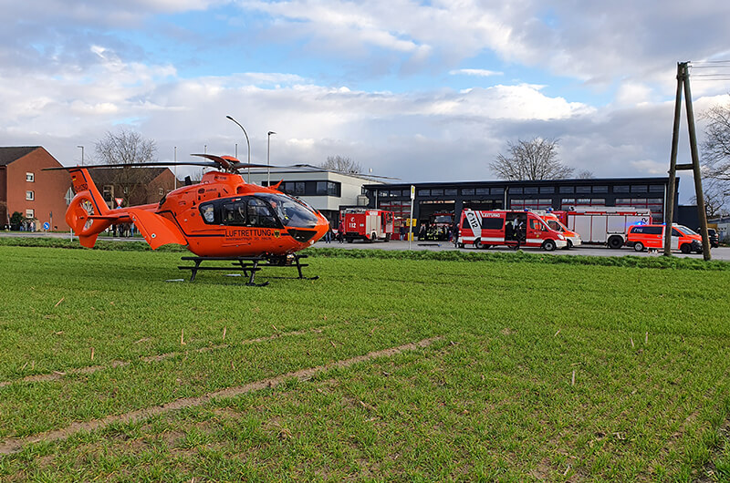 Bei der ersten Erkundung wurde Rauch an der verschlossenen Tür der Brandwohnung festgestellt. Daraufhin wurden unmittelbar 2 Trupps unter Atemschutz zur Menschenrettung in die Brandwohnung geschickt. Die Bewohnerin wurde im Schlafzimmer der verrauchten Wohnung angetroffen und vom Angriffstrupp ins Freie gebracht, wo sie an den Rettungsdienst übergeben wurde. Sie wurde nach einer Erstvorsorgung vor Ort mit einem Rettungshubschrauber einer Spezialklinik zugeführt.