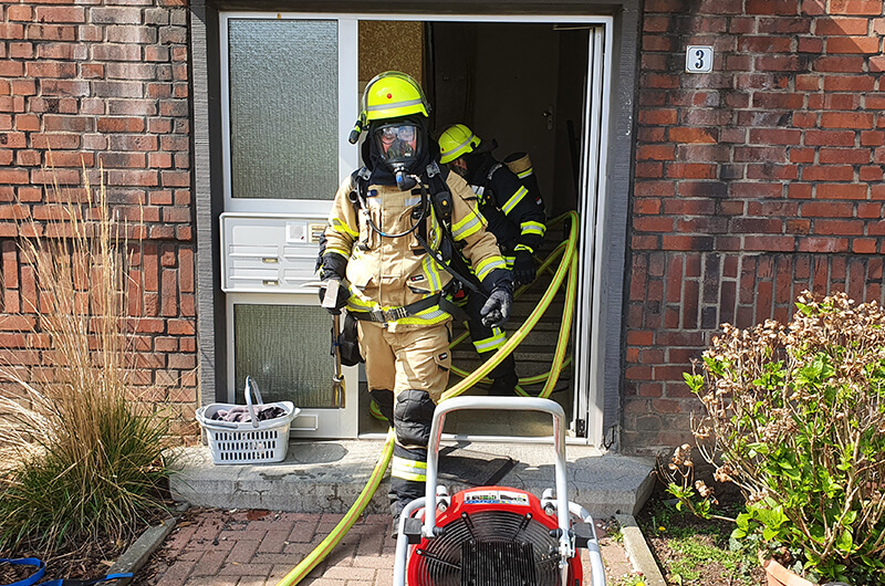 Bei Eintreffen konnte der Anwohner den Einsatzkräften mitteilen, dass sich keine Person mehr im Gebäude befindet. Leichter Rauch drang aus dem Treppenhaus und einer Wohnung im 1.Obergeschoss. Sofort ging ein Trupp unter Atemschutz mit einem C-Rohr ins Gebäude vor.