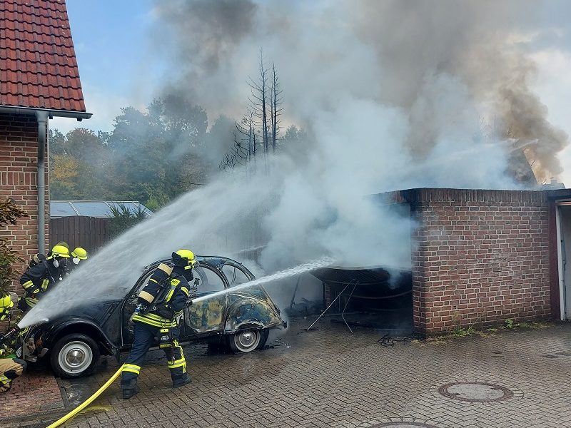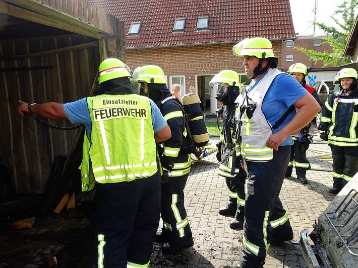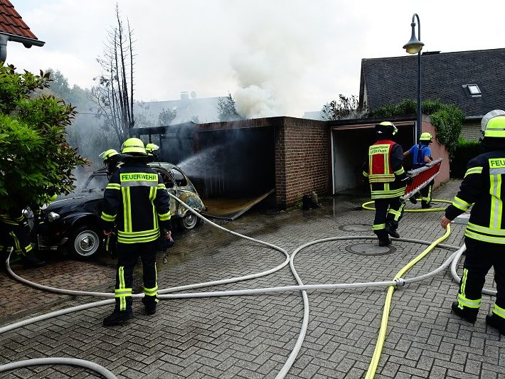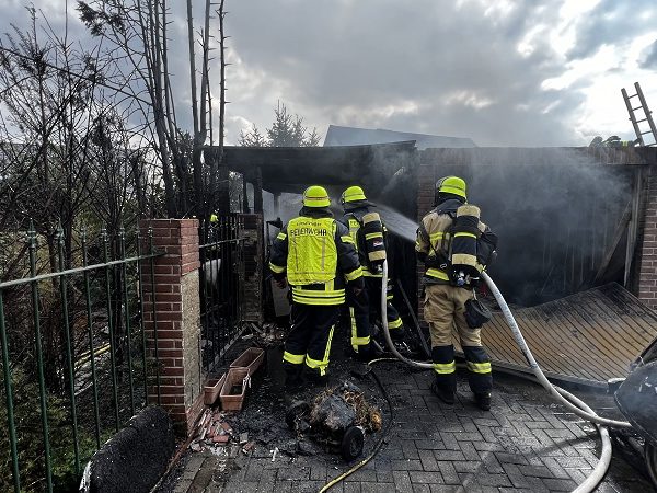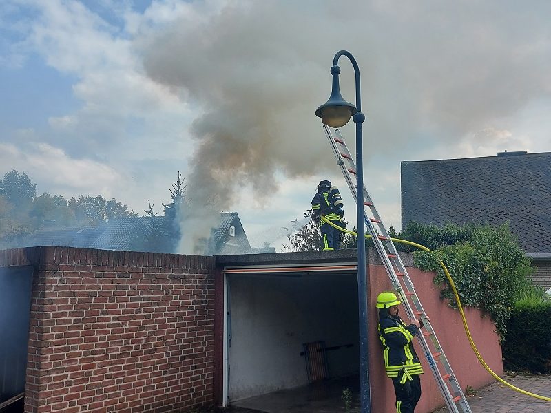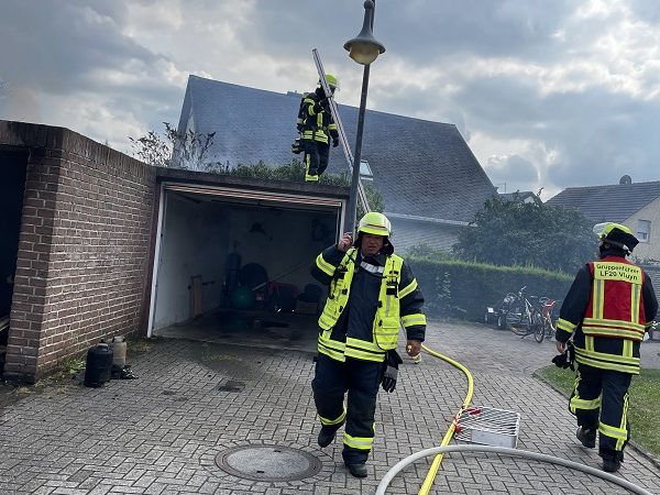 Bei Eintreffen der ersten Einsatzkräfte brannte ein PKW, eine Garage und ein Carport in voller Ausdehnung, da sich der Brand bereits stark ausgedehnt hatte. Das Feuer drohte auf das angrenzende Wohnhaus sowie ein angrenzendes Gartenhaus überzugreifen. Durch den Einsatzleiter wurde der Löschzug Neukirchen zur Einsatzstelle nachalarmiert sowie erneut Vollalarm für den Löschzug Vluyn ausgelöst.