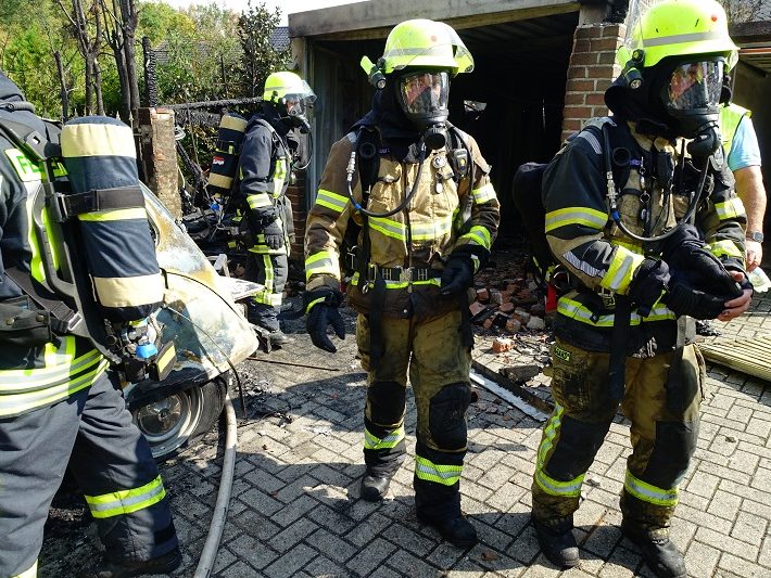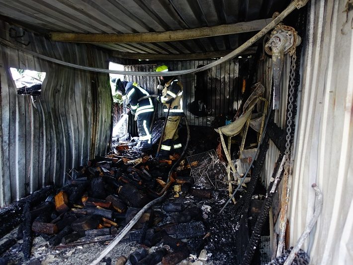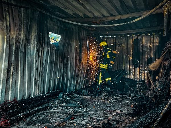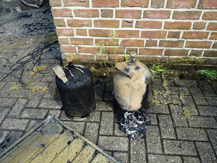 Sofort wurde die Brandbekämpfung mit vier C-Rohren von drei Trupps unter Atemschutz eingeleitet, um das Übergreifen auf die angrenzenden Gebäude zu verhindern. Kurz nach Beginn der Löschmaßnahmen öffneten die Sicherheitsventile von zwei Gasflaschen. Durch die Wärme dehnte sich das Gas in der Flasche aus und wurde durch das Sicherheitsventil der Gasflasche abgelassen, so wurde ein Druckgefäßzerknall der Gasflasche verhindert.
