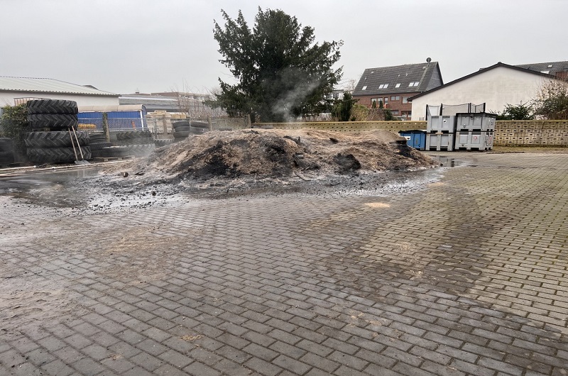 Sofort wurde ein massiver Löscheinsatz vorgenommen, um ein Übergreifen auf die gesamte Lagerhalle zu verhindern . Hierfür wurde unter anderem die Drehleiter mit dem Wenderohr sowie ein mobiler Wasserwerfer vorgenommen. Zudem wurde ein Dieseltank in der Brandhalle gekühlt. Um den Metallbrand zu bekämpfen wurden durch ein benachbartes Tiefbau-Unternehmen ca. 50-60 Tonnen Sand, zwei Radlader und ein Bagger zur Verfügung gestellt. Ein weiterer Radlader wurde durch das betroffene Unternehmen gestellt. Mit den Baumaschinen wurde der Sand auf das Brandgut gekippt und der Brand somit unter Kontrolle gebracht.
