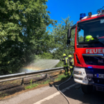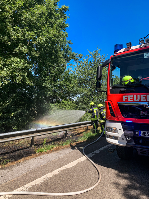 Die Feuerwehr wurde am Mittwochmorgen zu einem Grasbrand alarmiert. Auf dem Seitenstreifen hinter einer Leitplanke brannte eine Fläche von ca. 15x1m. Der Anrufer konnte bereits mit einem Pulverlöscher schlimmeres verhindern. Die Einsatzkräfte führten Nachlöscharbeiten mit einem C-Rohr durch und konnten anschließend wieder einrücken.