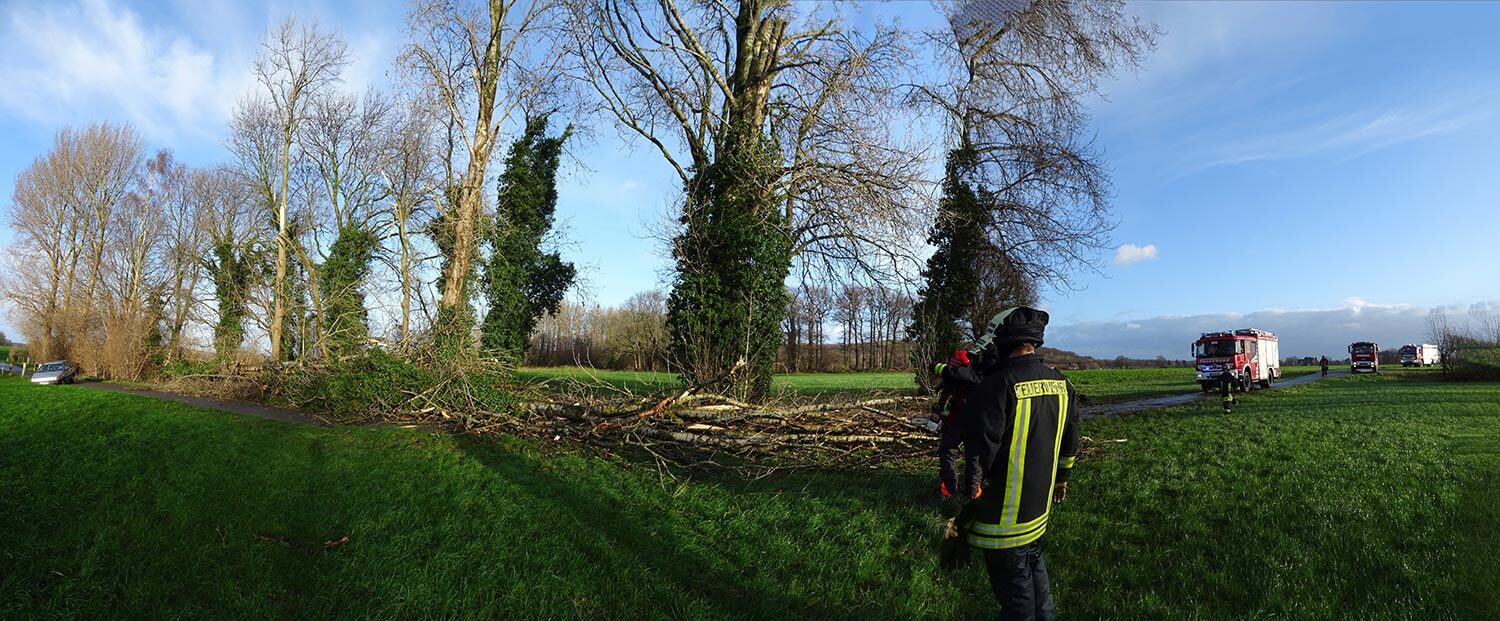 Da weitere lose Äste auf die Fahrbahn zu stürzen drohten, wurde die Drehleiter des LZ Vluyn nachgefordert. Aus dem Korb der Drehleiter wurden diese entfernt und so die Gefahr beseitigt.