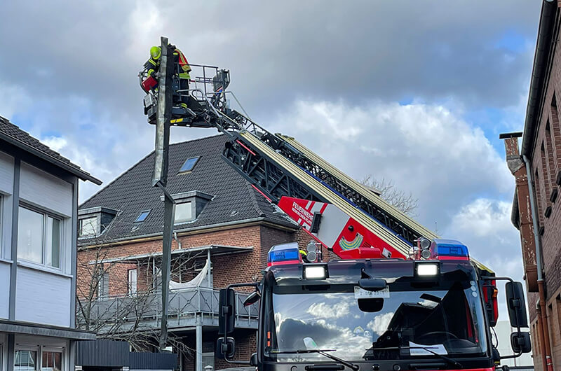 An der Kreuzung Krefelderstraße/Niederrheinallee im Ortsteil Neukirchen fielen Dachziegel auf die Straße, weitere lose Dachziegel drohten auf die Straßen zu fallen, sodass die Drehleiter nachalarmiert wurde und mithilfe der Drehleiter die Gefahr beseitigt wurde.