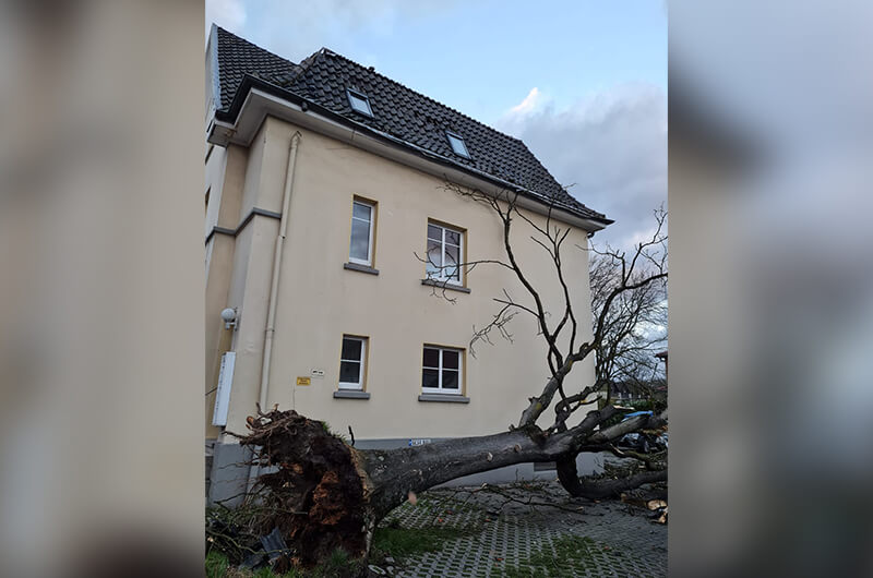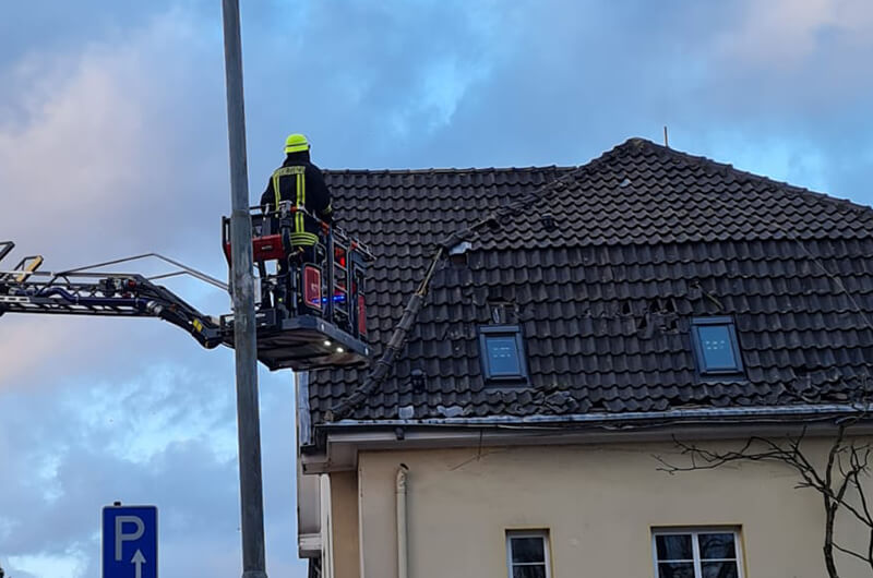 Auf der Pastoratstraße wurde ein Dach von den Böen so schwer getroffen, sodass sich ein Großteil der First und Dachziegel lösten und auf die Straße sowie auf die dort sich befindlichen geparkten Pkws fielen. Insgesamt 4 Pkws wurden durch die Dachziegel beschädigt. Mithilfe der Drehleiter wurden weitere lose Dachziegel entfernt sowie die restlichen Teile der First gesichert.