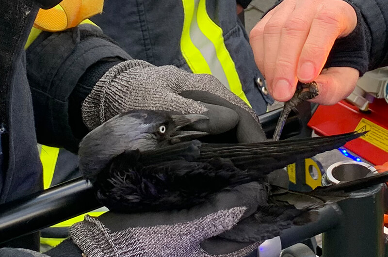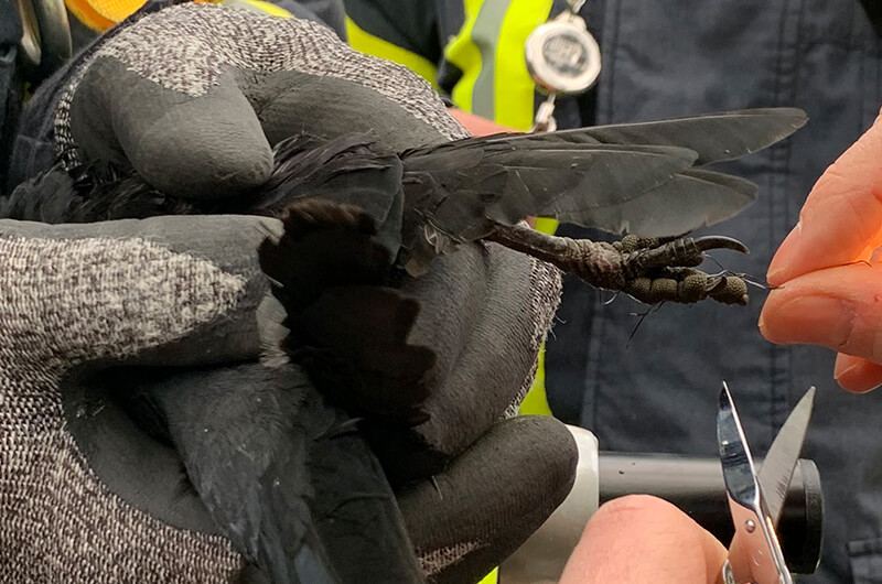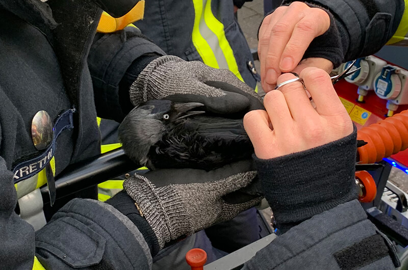 Am Boden wurde die Krähe, dann Dank einer Nagelschere (durch die Bewohner des Viertels verliehen), von der Angelschnur, welche sich mehrfach um die Kralle verfangen hatte, komplett befreit und anschließend der Natur übergeben.