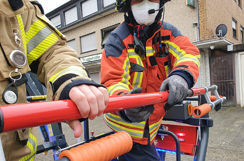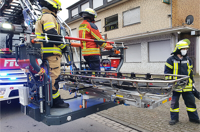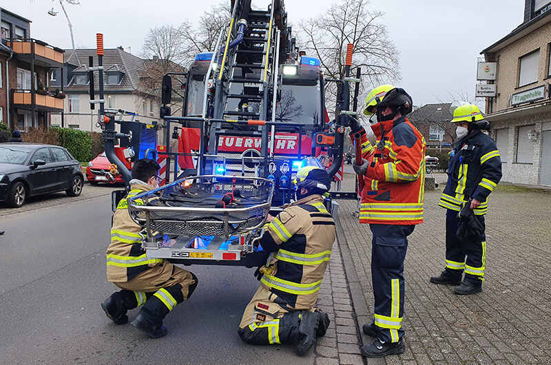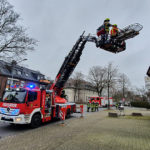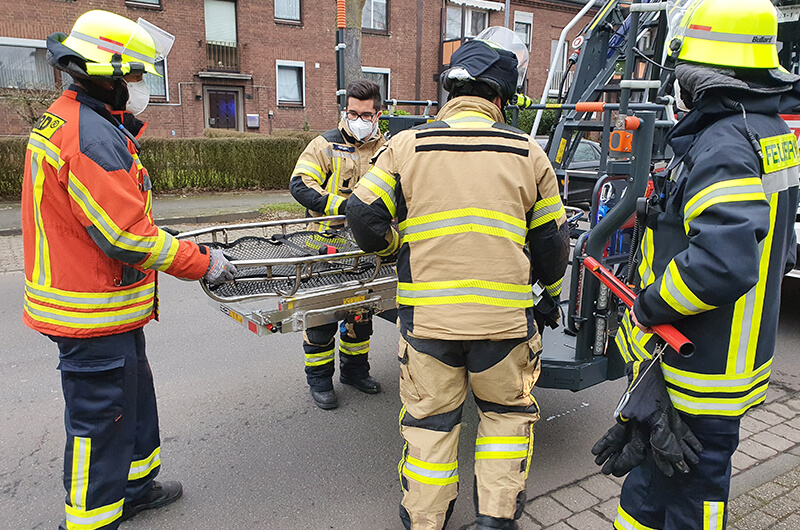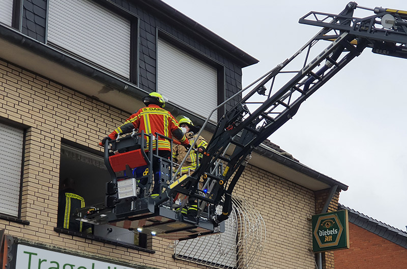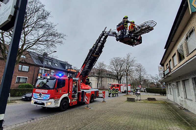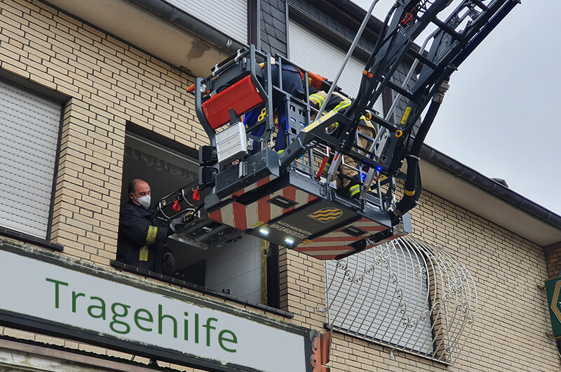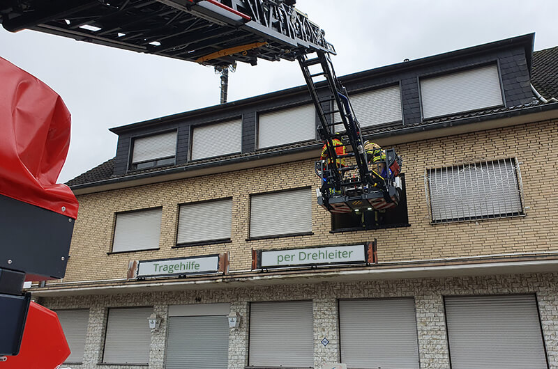 Der Rettungsdienst forderte die Feuerwehr zu einer Tragehilfe an. Ein Transport des Patienten durch das Treppenhaus war nicht möglich, sodass die Drehleiter in Stellung gebracht wurde.