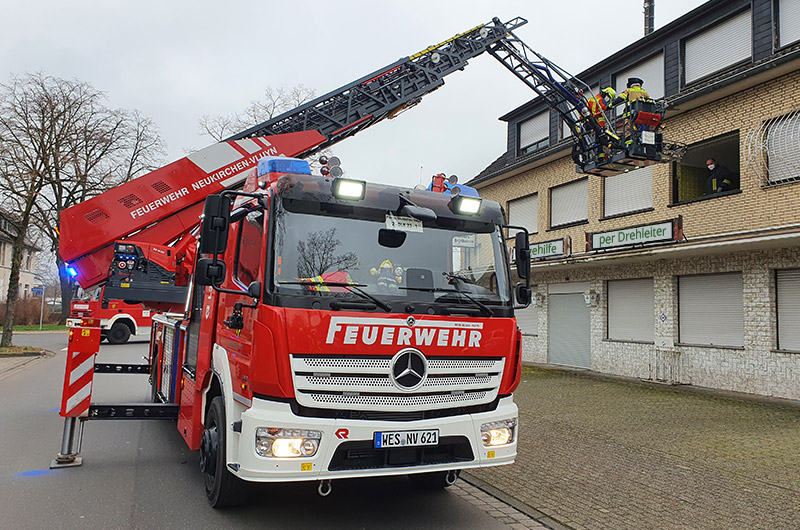 Fahrzeuge: LF 20-1 Neukirchen, LF 20-2 Neukirchen, KdoW Vluyn, DLK 23/12 Vluyn